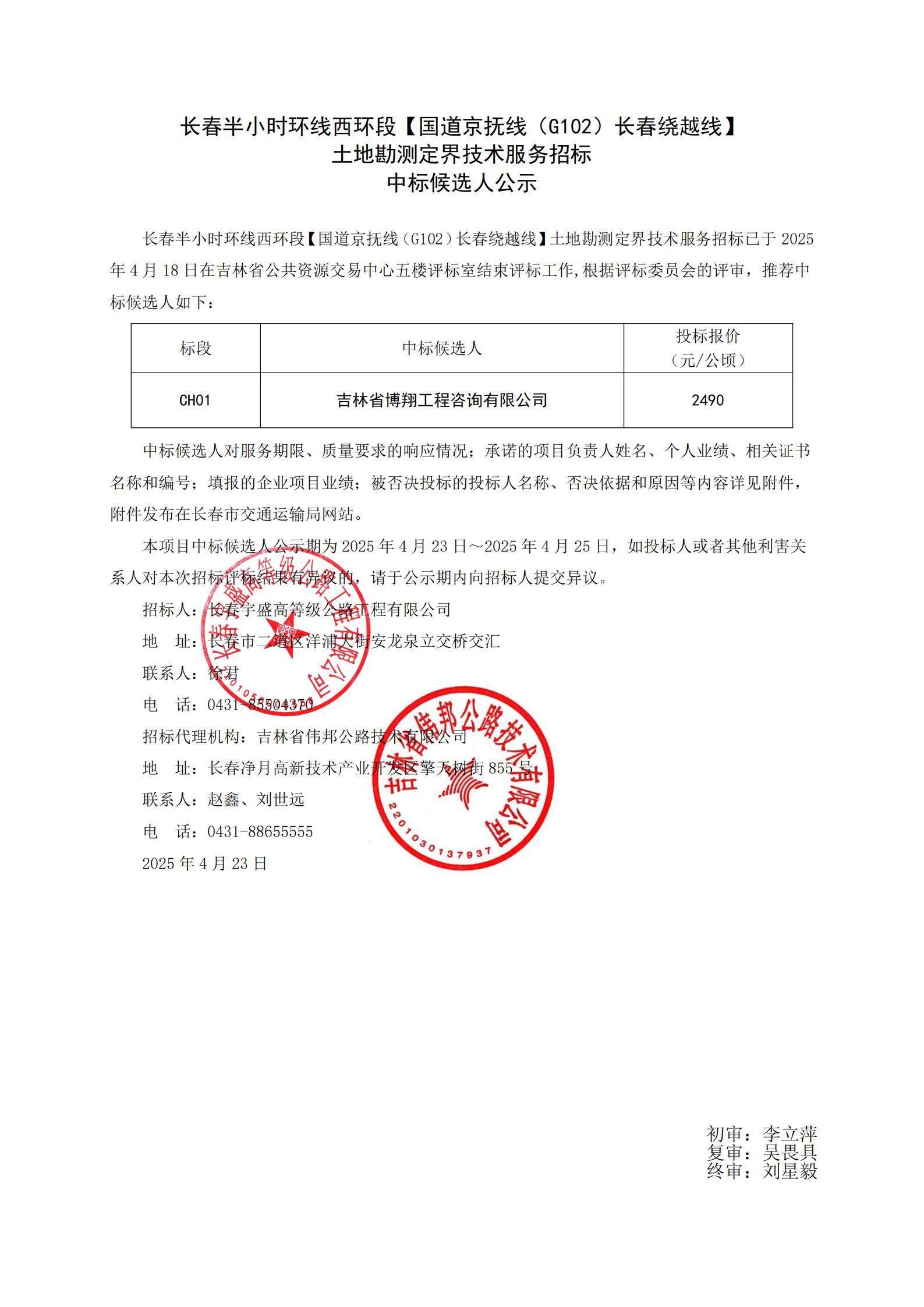 长春半小时环线西环段【国道京抚线(G102)长春绕越线】土地勘测定界技术服务招标 中标候选人公示