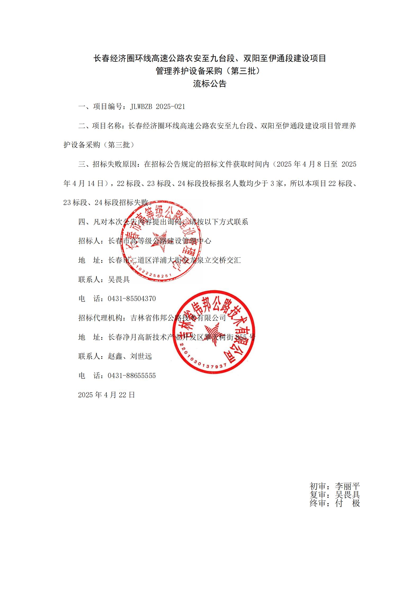 长春经济圈环线高速公路农安至九台段、双阳至伊通段建设项目管理养护设备采购(第三批)流标公告