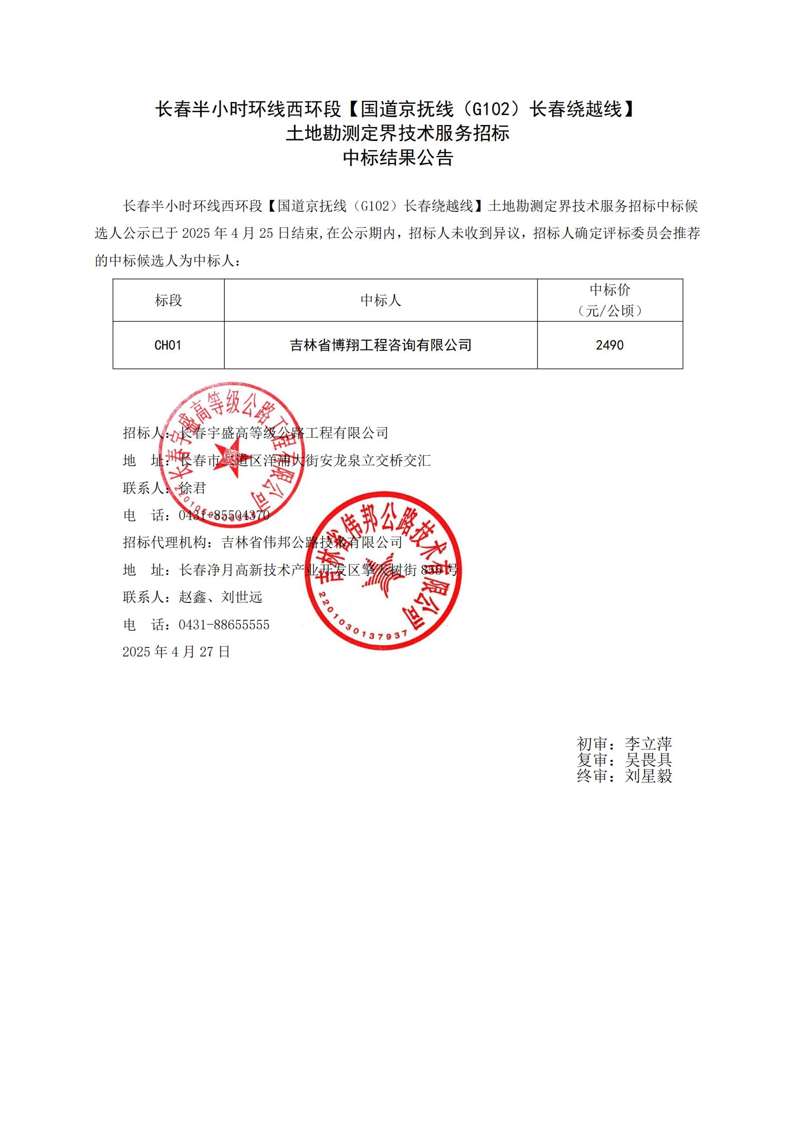 长春半小时环线西环段【国道京抚线(G102)长春绕越线】土地勘测定界技术服务招标 中标结果公告