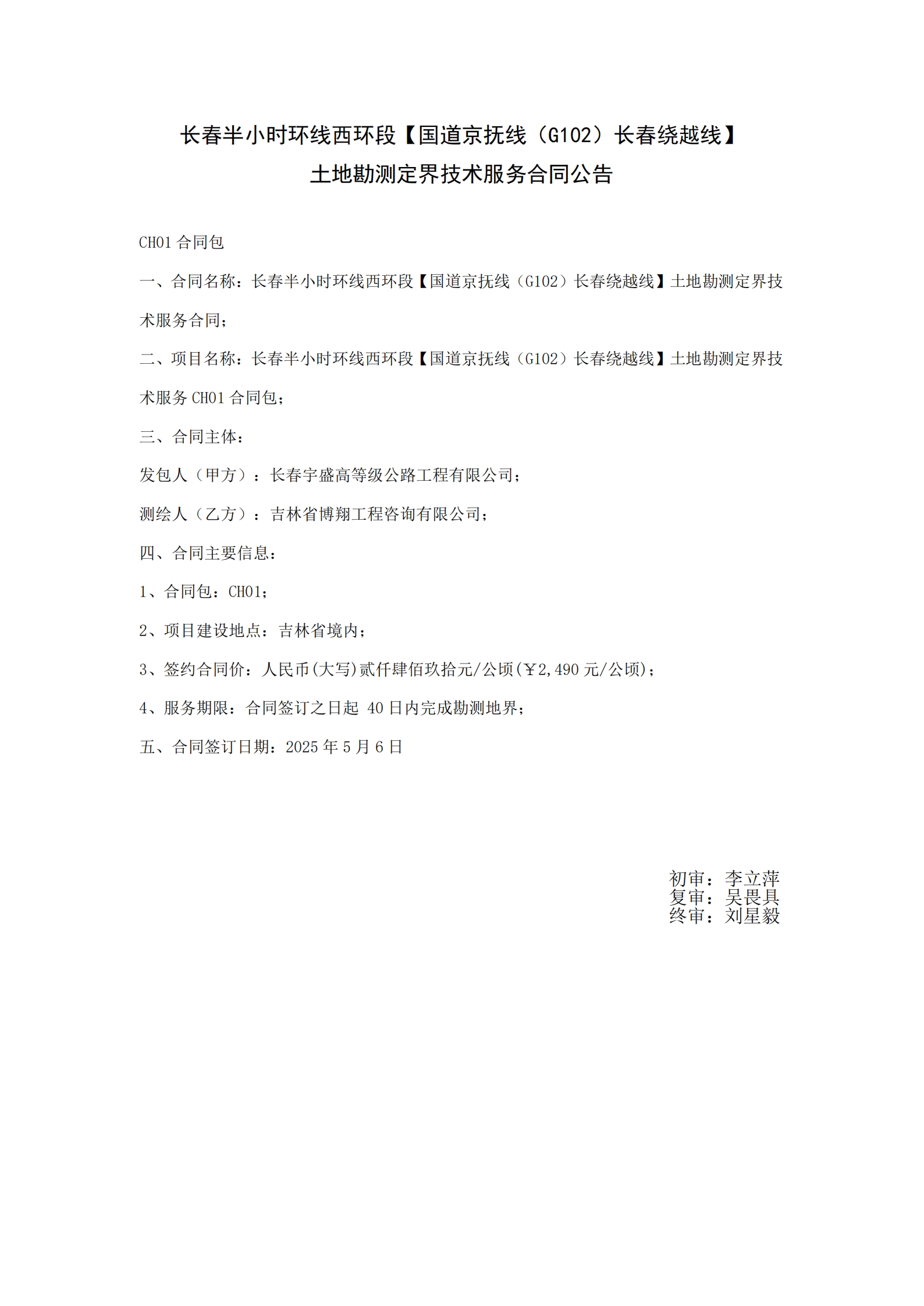 长春半小时环线西环段【国道京抚线(G102)长春绕越线】土地勘测定界技术服务合同公告