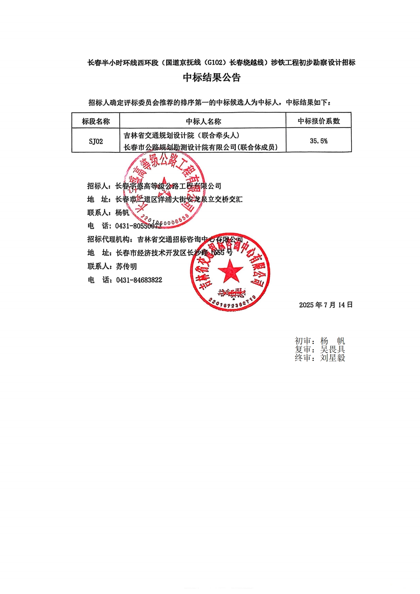 长春半小时环线西环段(国道京抚线(G102)长春绕越线)涉铁工程初步勘察设计招标中标结果公告