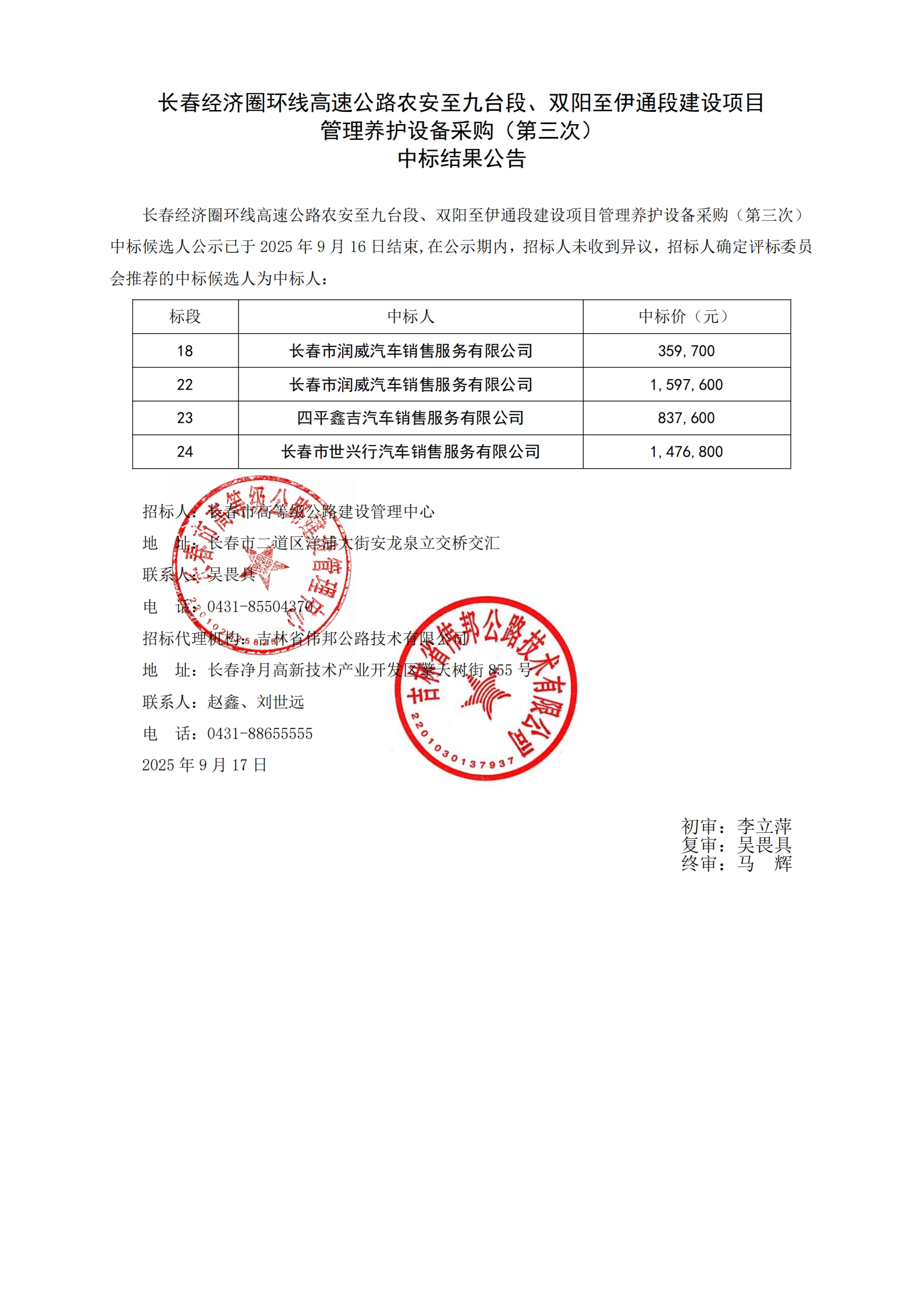 长春经济圈环线高速公路农安至九台段、双阳至伊通段建设项目管理养护设备采购(第三次) 中标结果公告