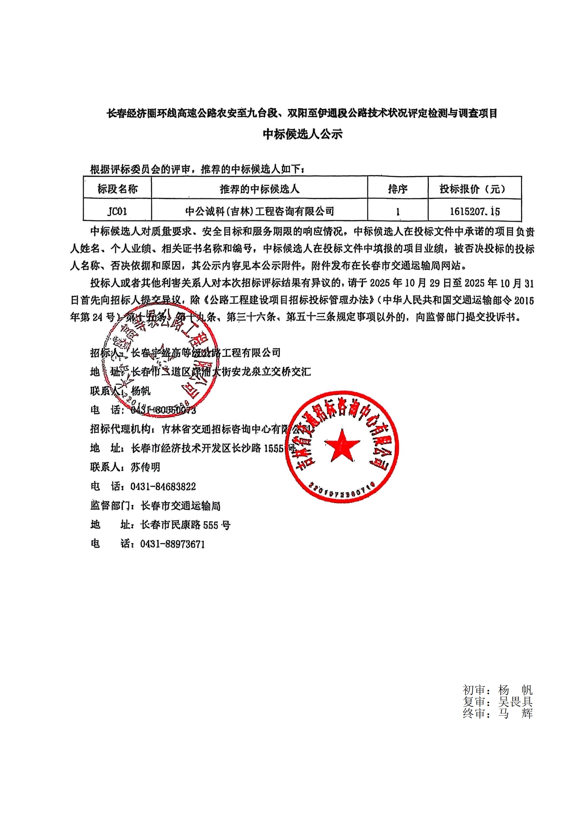 长春经济圈环线高速公路农安至九台段、双阳至伊通段公路技术状况评定检测与调查项目中标候选人公示