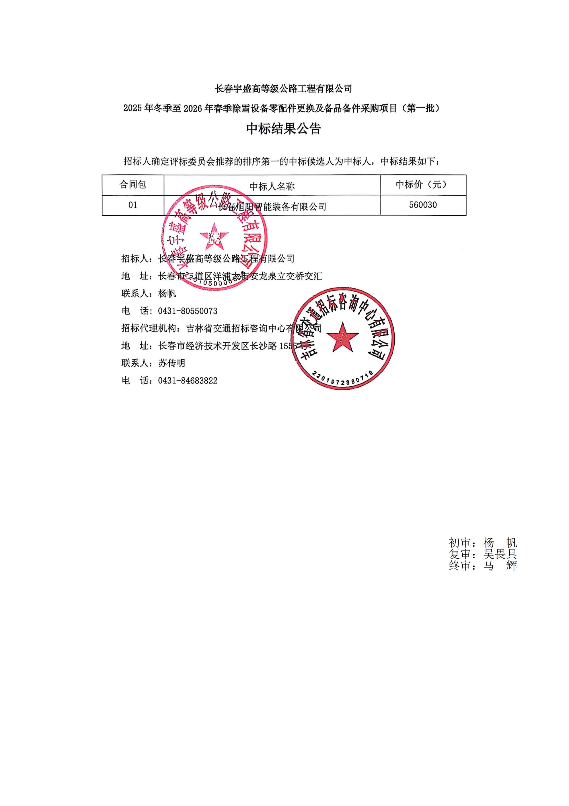 长春宇盛高等级公路工程有限公司2025年冬季至2026年春季除雪设备零配件更换及备品备件采购项目(第一批)中标结果公告