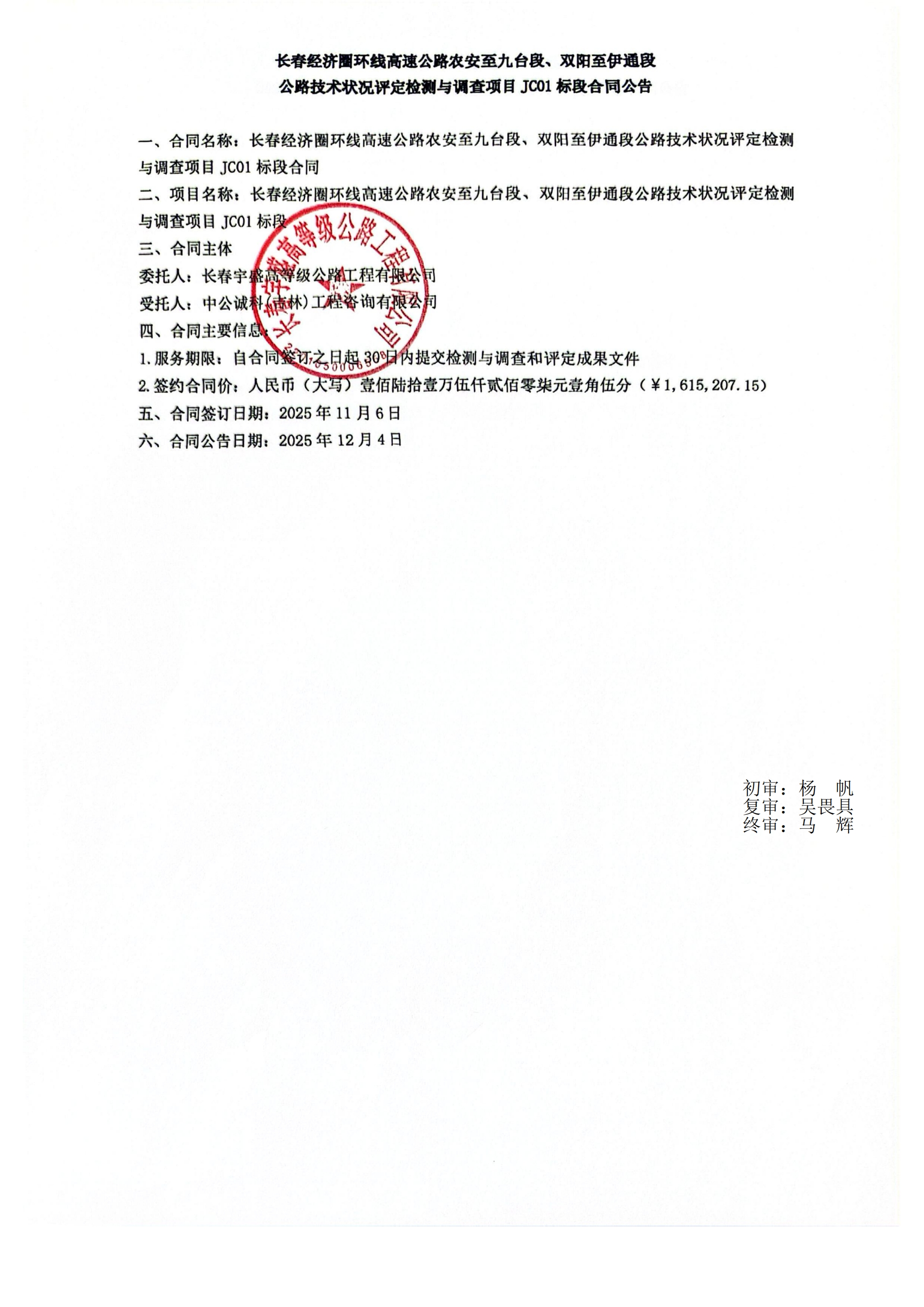 长春经济圈环线高速公路农安至九台段、双阳至伊通段公路技术状况评定检测与调查项目JC01标段合同公告