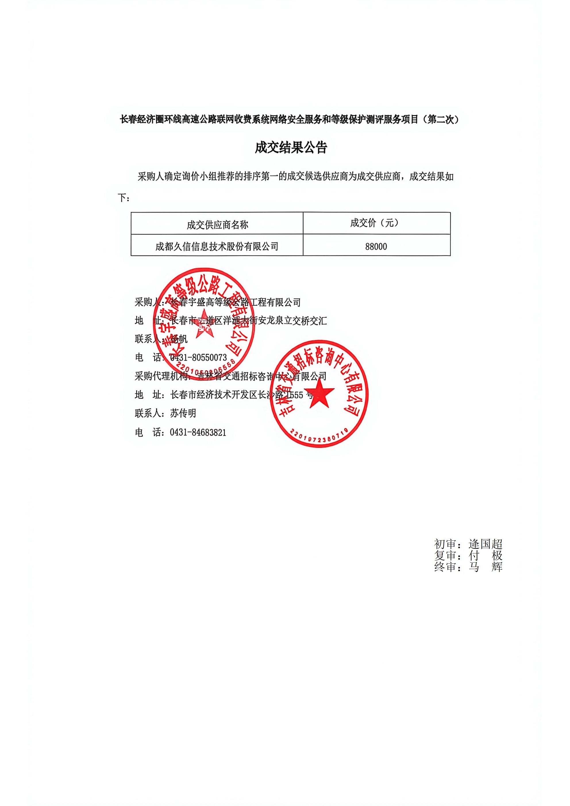 长春经济圈环线高速公路联网收费系统网络安全服务和等级保护测评服务项目(第二次)成交结果公告
