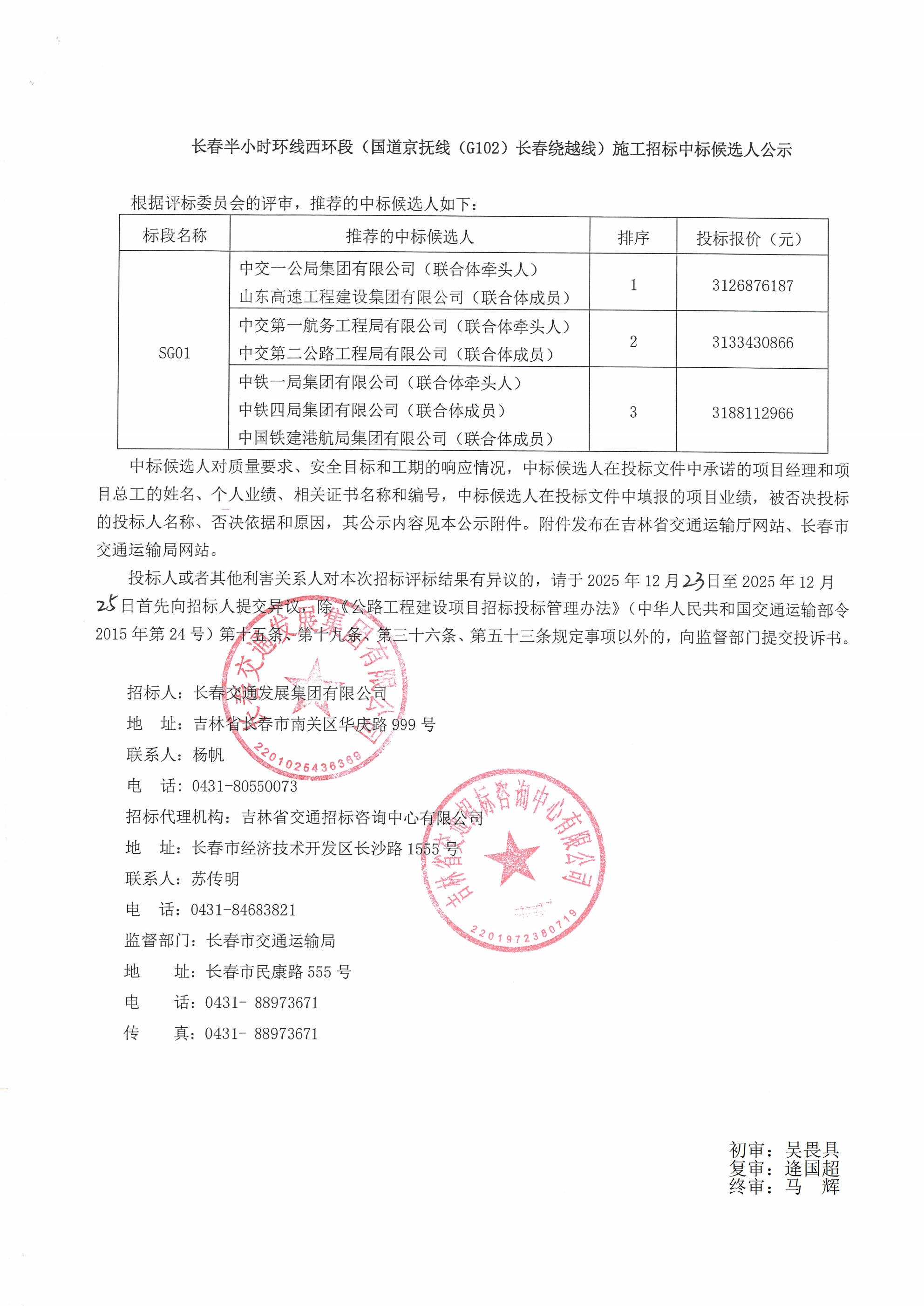 长春半小时环线西环段(国道京抚线(G102)长春绕越线)施工招标中标候选人公示