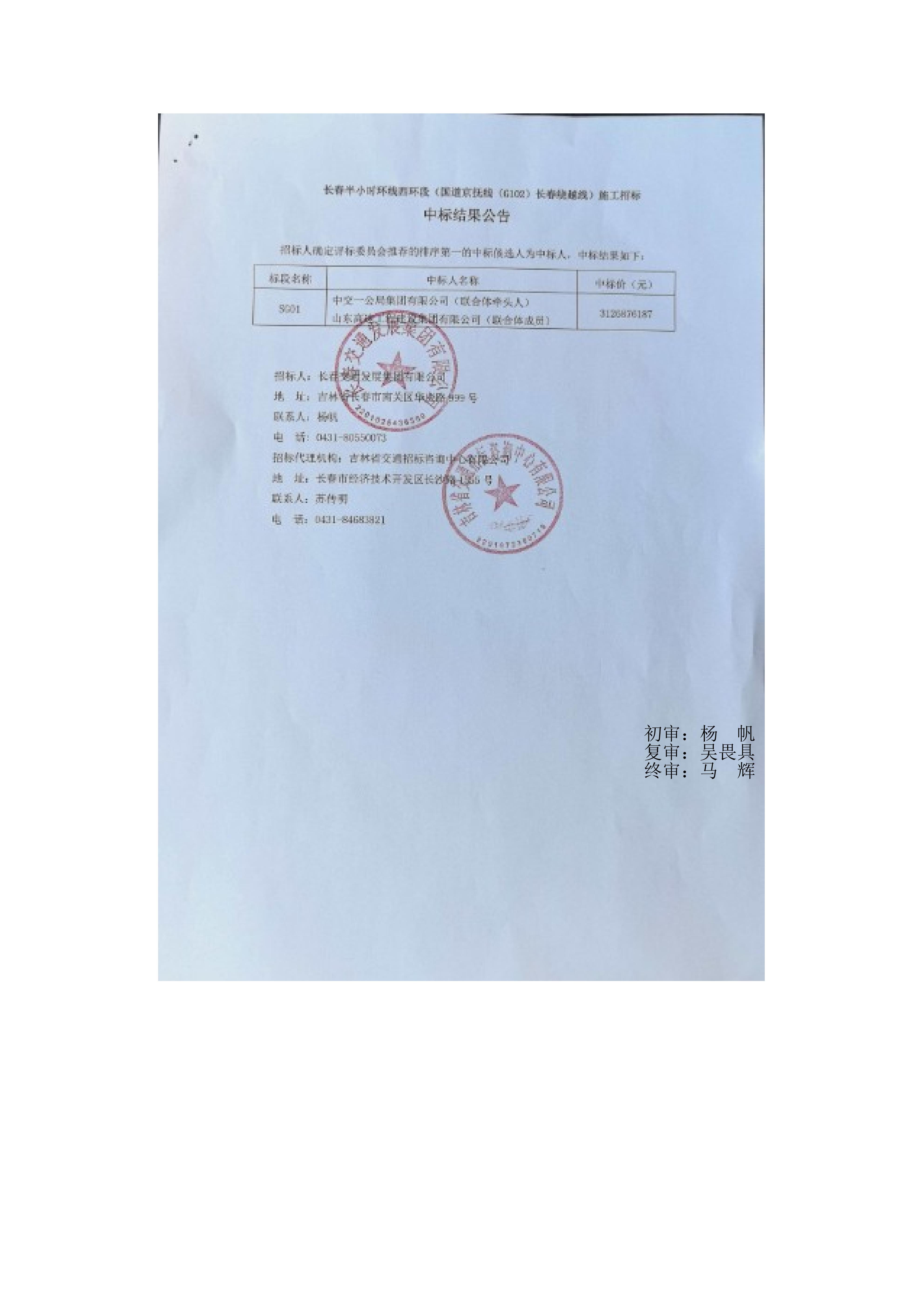 长春半小时环线西环段(国道京抚线(G102)长春绕越线)施工招标中标结果公示