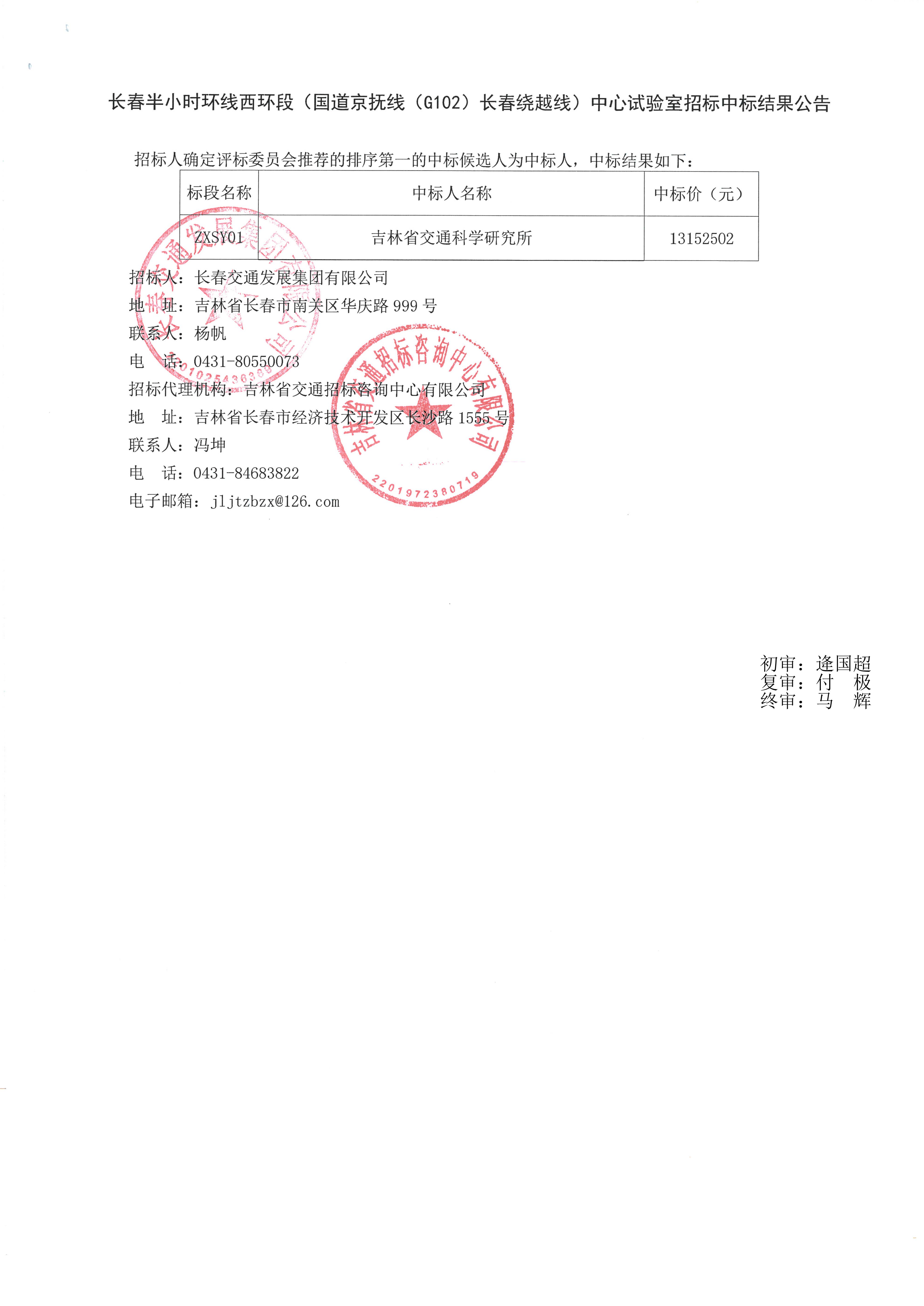 长春半小时环线西环段(国道京抚线(G102)长春绕越线)中心实验室中标结果公告