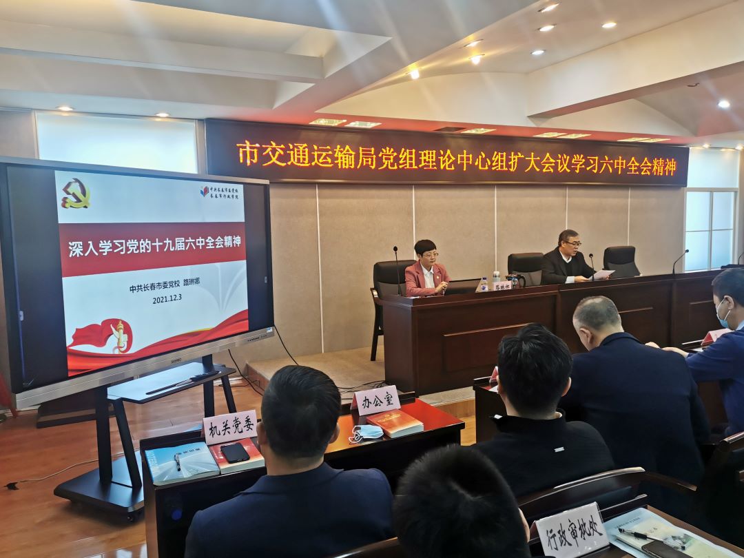 2021年12月3日8时30分, 十大足彩平台组织召开局党组理论中心组扩大会议,局党组成员、局机关全体干部职工、局属各单位班子成员、各党支部书记集体学习党的十九届六中全会精神。会议还邀请了中共长春市委党校哲学教研部教师路琳娜,带领大家深入学习党的十九届六中全会精神,切实把思想和行动统一到党中央的决策部署上来。