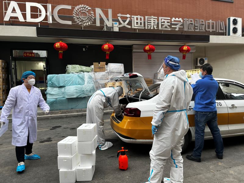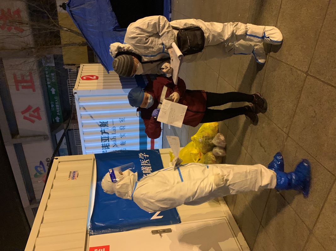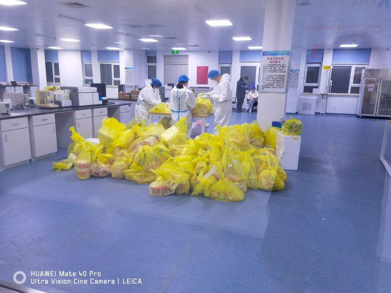 在金域中心实验室,第9派驻组全力克服“三个困难”坚守防疫一线,一是客服人员少困难。相比其他派驻组4至5名组员,第9派驻组仅有2名同志,在组长王鹤带领下,采取共同坚守、分段排班,主动放弃实验室提供的办公室,毅然站在大门口、实行前端拦车登记方式,把好入进车口第一道关卡,如实详细做好转运车辆运抵样本情况记录和统计报数。协调实验室组建驻点微信群,实时比对采集端、转运端、运抵端各项数据,实现人工登记数据与实验室实时数据完全吻合,为科学掌握和调度运力等提供有力支撑。二是克服身体及家庭的困难。组长王鹤克服妻子在医院工作,从3月11日至今一直坚守防疫一线没回家,年幼孩子无人看管困难,舍小家、顾大家,坚守工作岗位做好登记数据统计等工作。特别是在驻点以前,3月15日晚,按照国务院督导组、市委组织部关于当晚全市样本全部汇集至此的紧急要求,他只身一人前往核子华曦方舱,在没有防护服、大雪漫天等恶劣条件下,接收和登记转运样本1271箱、77190管,直至凌晨3时许圆满完成紧急转运任务。组员马凯心脏做过大手术,全身四处介入伤口,但尽管他随身携带急救药,也要熬夜坚守一线,每日工作至次日凌晨2至3点,登记详细认真负责,拍照留存建立电子档案,站好最后一班岗毫无怨言。三是克服防疫物资短缺等后勤保障困难。组长王鹤积极与实验室沟通,保障实验室供应全组防护服、口罩、手套、护目镜等全套防疫物资,以及吃饭等问题。