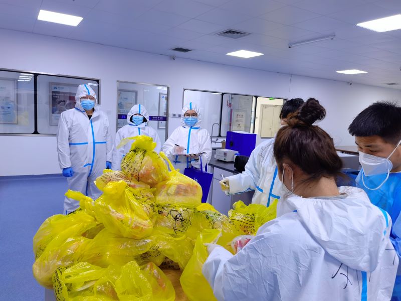 在迪安实验室驻点,日均产能8万,每日到达转运车辆一百余台次,任务重工作量大,组长曹迎宾同志带领组员克服没有工作场所等实际困难,每天都工作到次日天亮,同时为了数据的准确,每名组员都要到样本交接处拍照核对从不退缩,还利用自己驻点迪安实验室消杀病菌的间隙,全体投入到任务量巨大的核子华曦方舱,帮助别的点位工作,毫无怨言,用自己的实际行动践行党员的铮铮誓言。