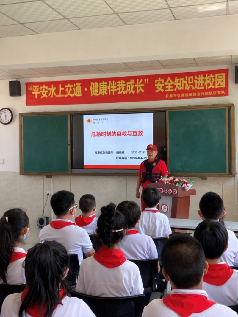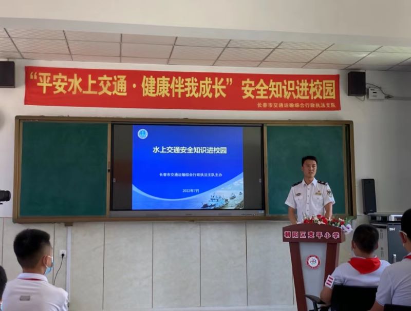 背景提示:2022年7月11日是我国第十八个中国航海日,为切实提升我市中小学生水上交通安全意识,提高自护、自救技能,营造全社会共同关注水上交通安全和预防学生溺水良好氛围,为出行安全提供有力保障。2022年7月11日,长春市交通运输综合行政执法支队联合海事红剑救援队、朝阳实验教育集团宽平校区、长春晚报社对中小学开展“平安水上交通·健康伴我成长”主题宣讲活动。通过“中国航海日”走进校园对水上安全知识的宣传,大力普及水上交通安全知识,持续提升了中小学生和社会群众的安全意识,较好地凝聚了广大群众重视水上交通安全的共识。