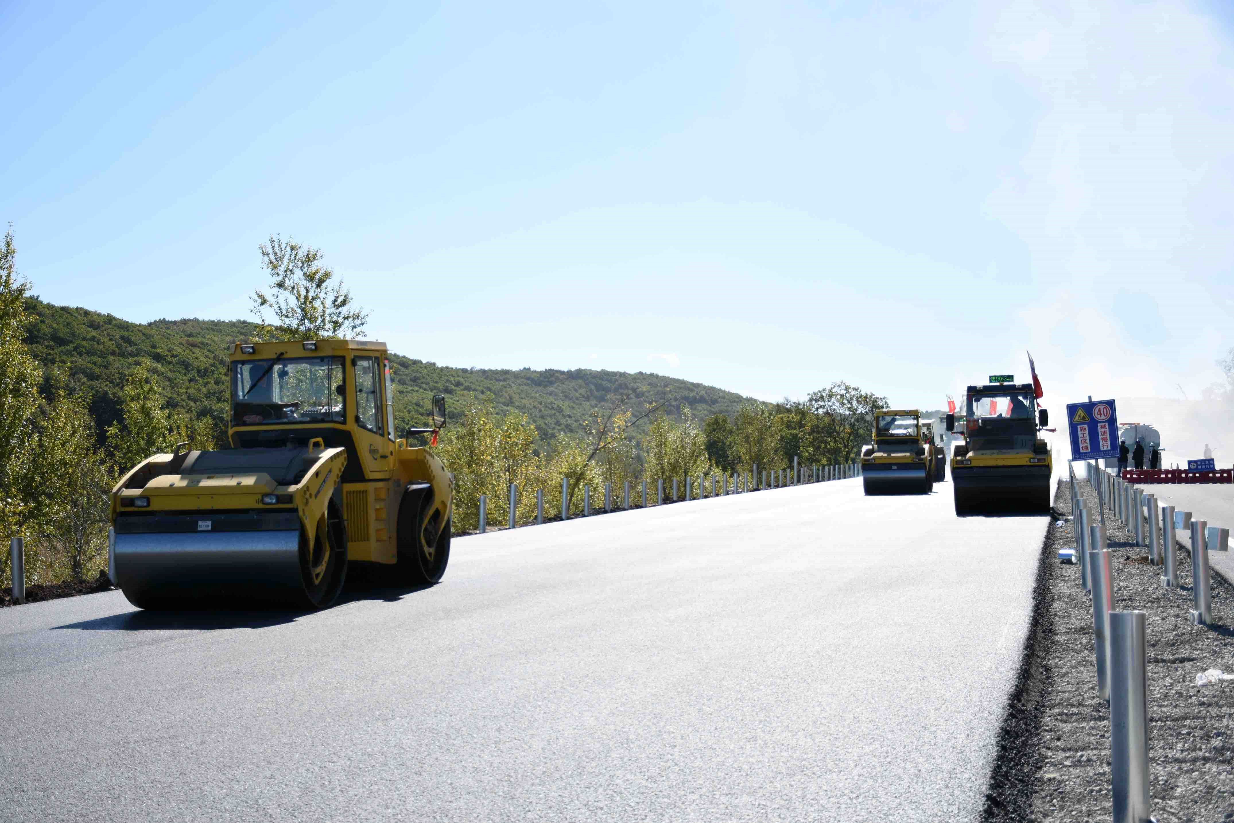 在一期项目路面一工区施工现场,工人们正在进行最后一层沥青面层的摊铺工作,随着1台大型摊铺机将滚烫的沥青均匀摊铺在道路上,数台压路机紧随其后,来回有序反复碾压,一条平整的沥青路面随即展现在眼前。