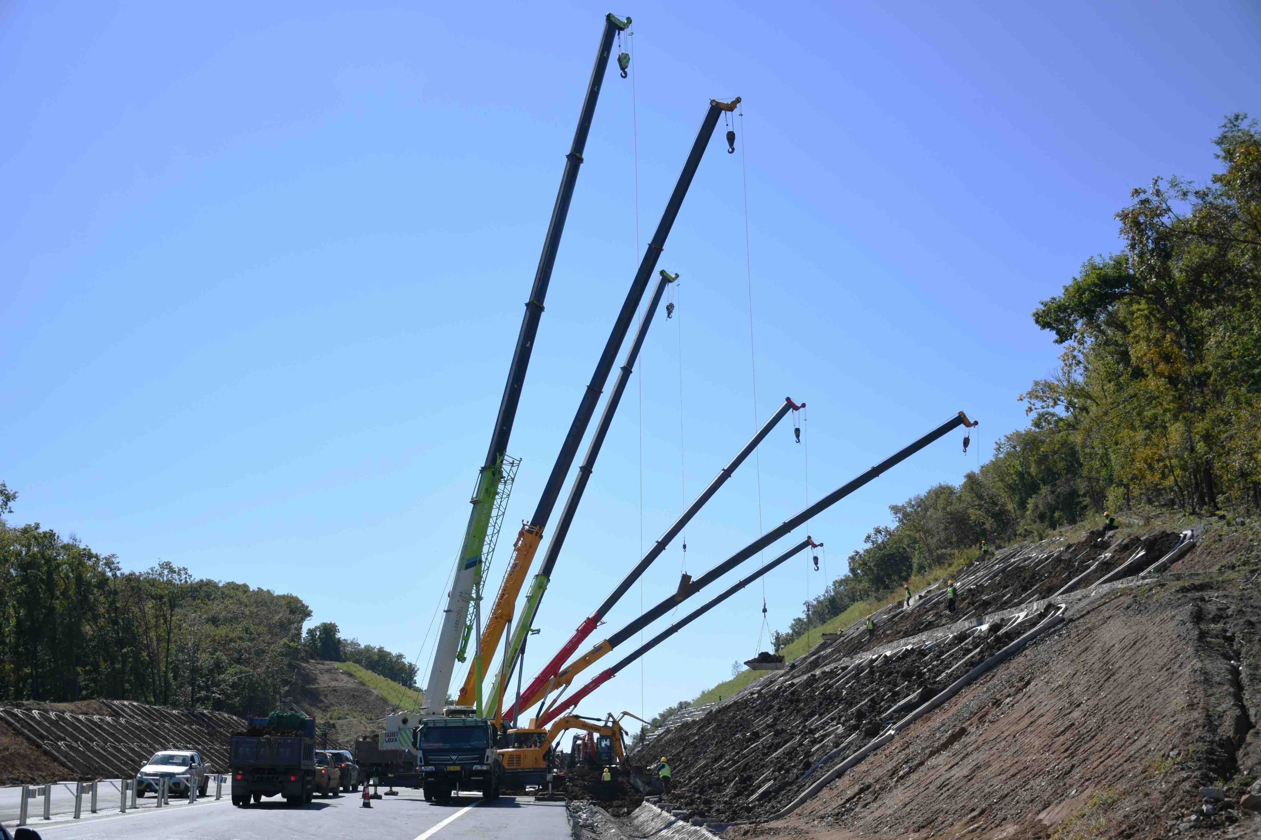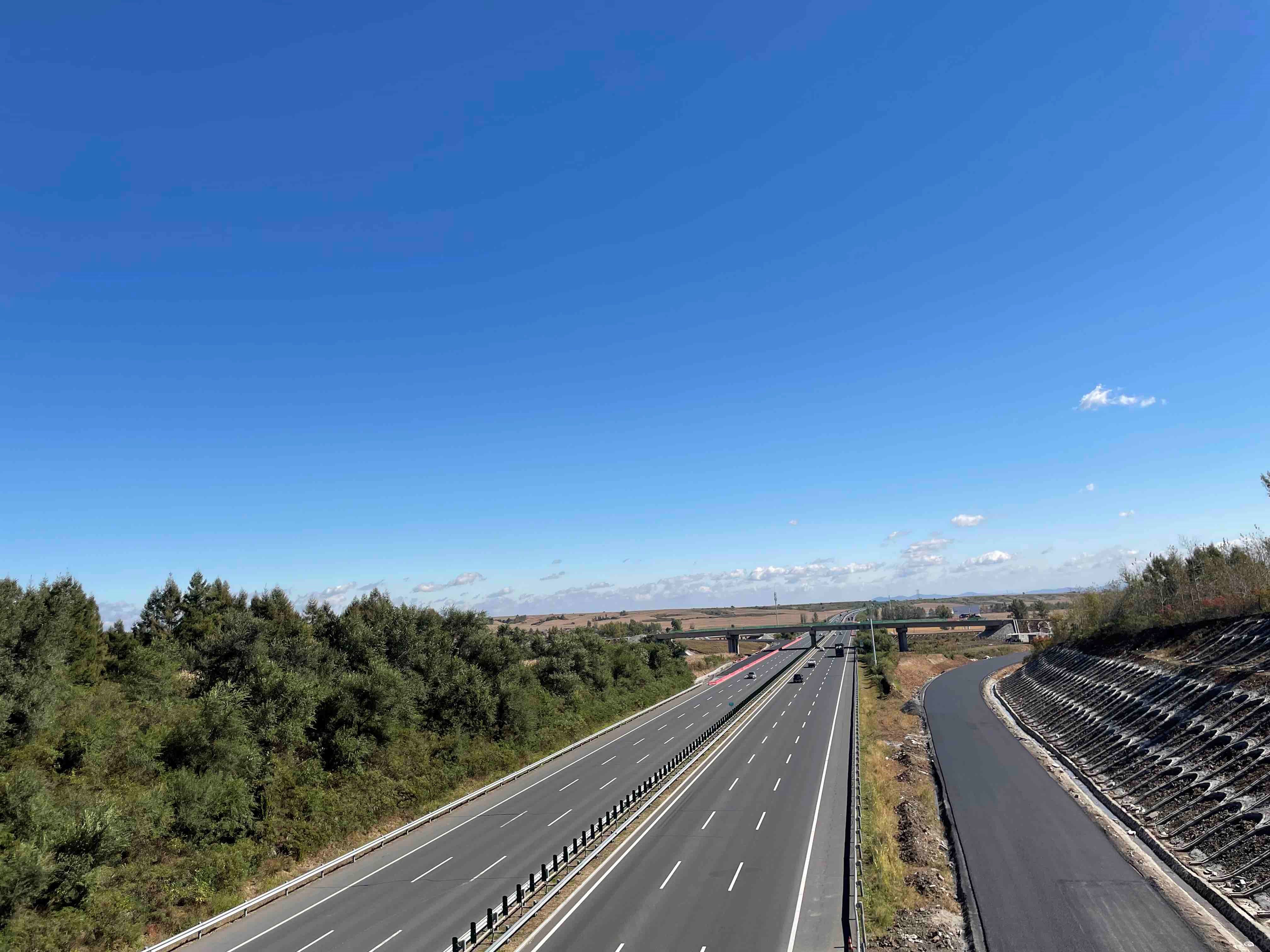 在工程一期起点——九台南收费站施工现场,挖掘机、打孔机、铲车、罐车等10余台机械设备来回穿梭,100余名工人分工明确,各司其职,铺装路缘石、人行步道方砖等工作有序推进;公路两侧,巨型塔吊长臂挥舞,挖掘机、运输机轰隆作响,往来频繁,数十名工人正在进行边坡填土工作;K130桩号附近中央分隔带,12台打桩机正在高速作业,伴随着打桩机嗒嗒的锤击声,一根根护栏立柱被牢牢地钉入地下,放眼望去,银色的镀锌钢立柱一字排开,整齐划一,在阳光下熠熠闪光……