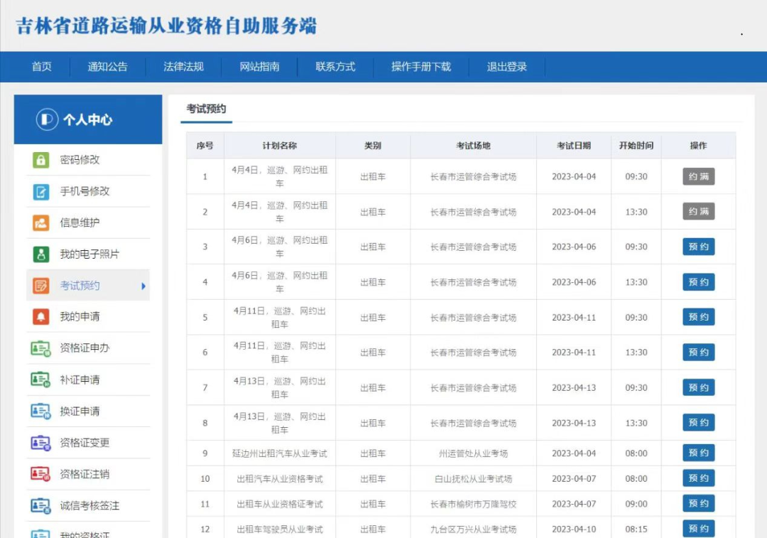 第二步:考试预约。审核通过后,申请人选择考试预约,在这里可以查看近期全省各地区25个从业资格考场的考试计划和预约情况,申请人可结合个人实际选择省内任意考场预约考试。预约成功后会收到短信提醒,考生按照规定的时间、地点参加考试。