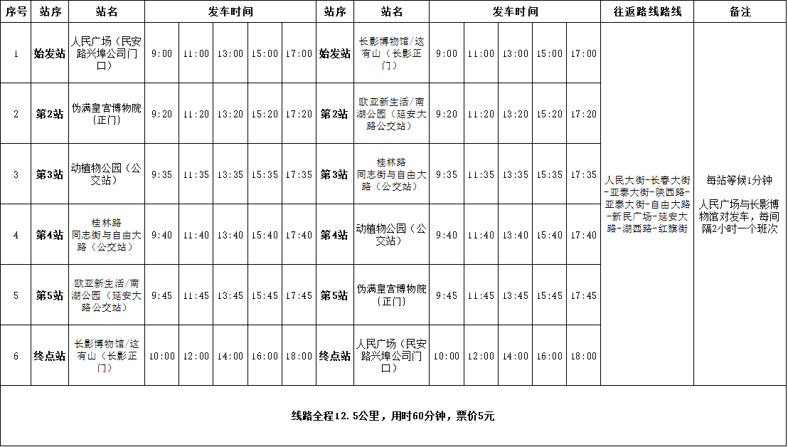 为进一步提升长春市文旅产业发展,保障市民和游客前往商圈和景区交通出行需求,市交通运输和文旅部门围绕市内商圈和外围景区,计划开通11条旅游定制公交线路,5月1日正式试运营,其中市内至外围景区9条,分别为乐山镇、石头口门水库、莲花岛影视基地、神鹿峰、国信南山、陈家店生态园、天定山、天怡温泉、慢山里线路;市内串联商圈和景点线路2条,分别为市内文旅1号线(长影、这有山、桂林路、动植物园、伪满皇宫等)、市内文旅2号线(北湖公园、万寿寺)。