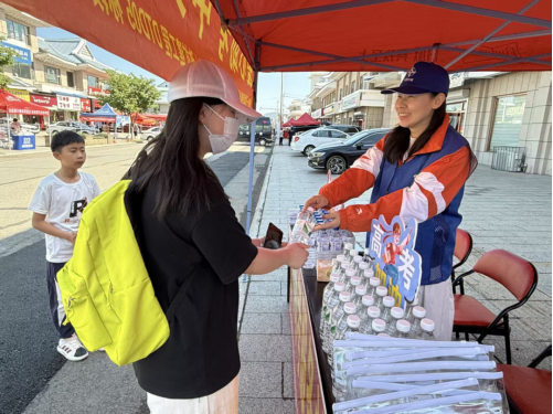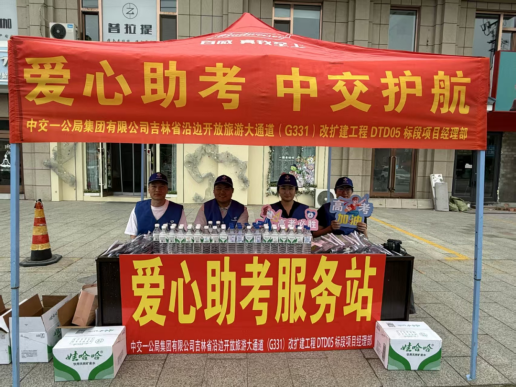 G331项目05标段志愿者身着蓝马甲,在和龙市文化小学高考考点搭建暖心服务站。志愿者们为考生准备了2B铅笔、中性笔等文具及矿泉水,并为陪考家长提供矿泉水、邀至遮阳棚休息。